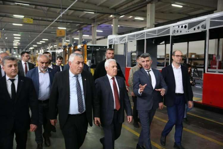 Ardından montaj ve üretim alanını gezen Bozbey, düşük alt yapı maliyetiyle daha çok yolcuya hizmet verme amacı güden metrobüsün yapım aşaması hakkında bilgi aldı.