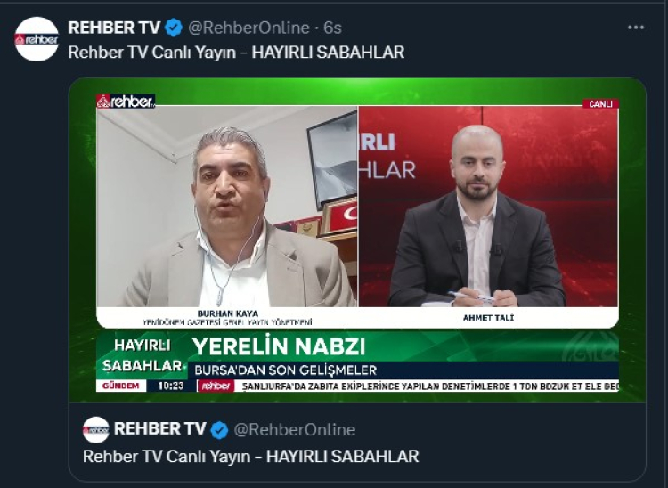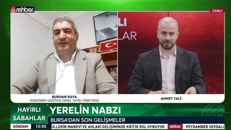Ulusal çapta yayın yapan Rehber TV’de Ahmet Tali’nin sunduğu Hayırlı Sabahlar programına konuk olan YeniDönem Gazetesi Genel Yayın Yönetmeni Burhan Kaya, Bursa’nın güncel sorunları ve geleceğine dair önemli değerlendirmelerde bulundu.