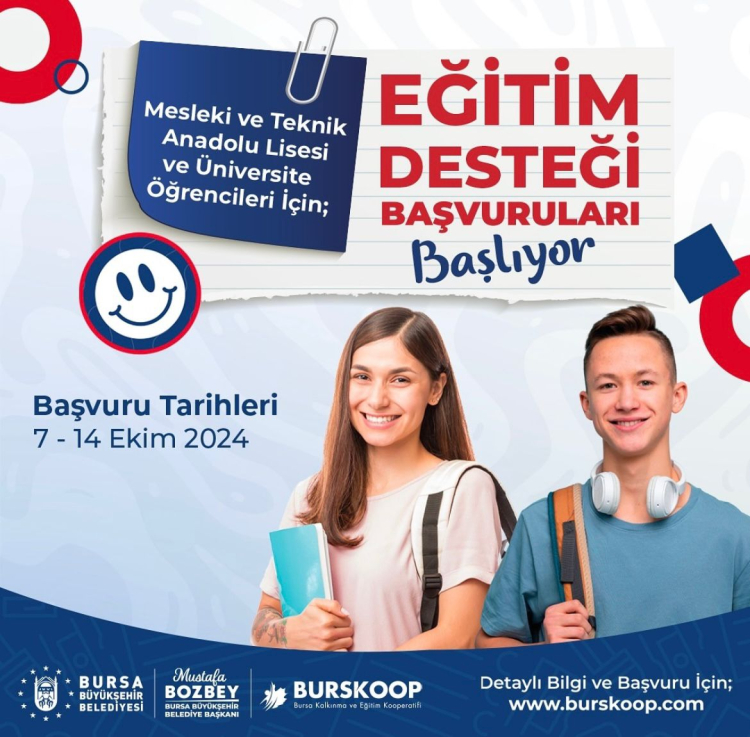 Sanayi kenti Bursa’nın ara kademe eleman ihtiyacını karşılamak için meslek liselerine de eğitim desteği sağlayan Büyükşehir Belediyesi, 2024-2025 eğitim ve öğretim döneminde üniversite öğrencileri ile mesleki ve teknik anadolu lisesi öğrencileri için vereceği BURSKOOP Eğitim Desteği’ne başvurular başlıyor. Başvurular, 7-14 Ekim tarihleri arasında www.burskoop.com internet adresinden online olarak yapılacak. Başvuru sürecinde istenecek belgelere, başvuru şartlarına ve başvurunun nasıl yapılacağına dair bilgilere öğrenciler yine BURSKOOP’un internet sitesinden ulaşabilecek.