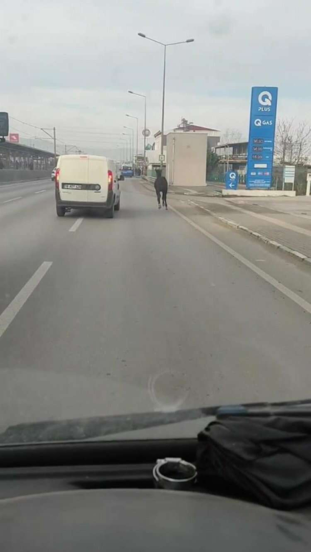 Bursa’da trafikte koşturan başıboş tay vatandaşlar tarafından kaydedildi. Adeta araçlarla yarışan tayı bir araç yan yola yönlendirmeye çalışsa da başarılı olamadı.