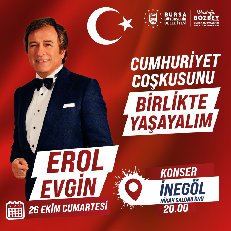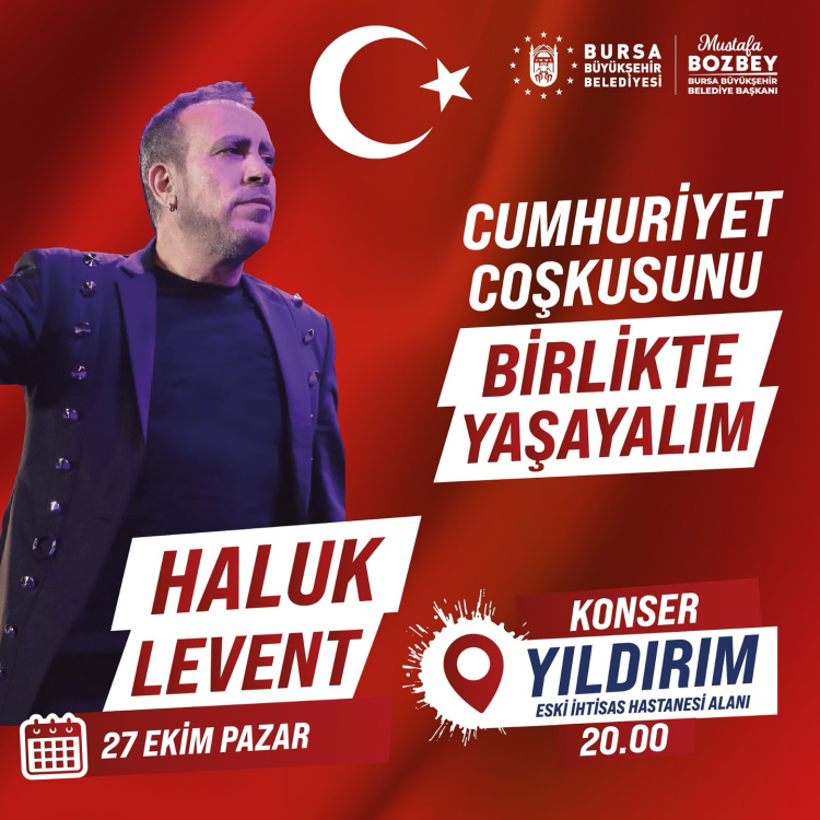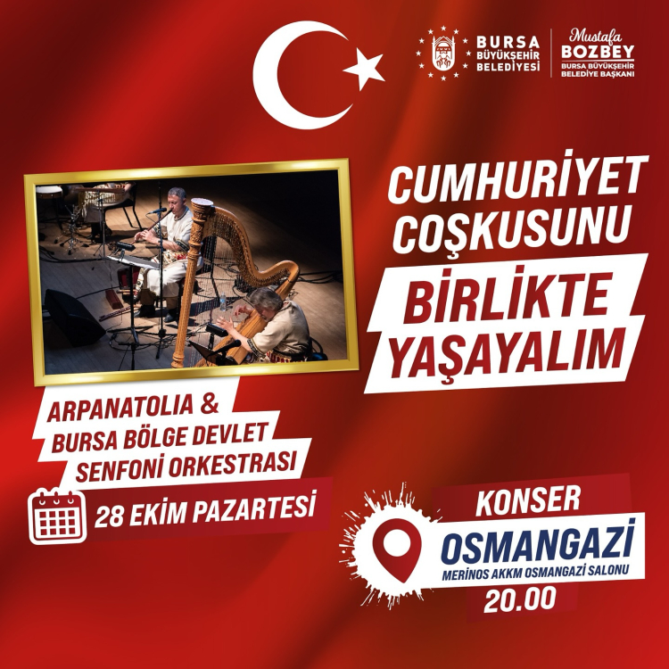 Kültür AŞ tarafından özenle hazırlanan ‘Cumhuriyet Tırı’ ile bu yıl 101. yıl dönümü kutlanacak olan 29 Ekim Cumhuriyet Bayramı’nın heyecanını tüm ilçelere taşıyan Bursa Büyükşehir Belediyesi, Ulu Önder Mustafa Kemal Atatürk'ün "Benim en büyük eserim" dediği Cumhuriyet'in değerlerini Bursalılarla buluşturuyor. Bu yıl 101. yıl dönümü kutlanacak olan 29 Ekim Cumhuriyet Bayramı için özel bir program hazırlayan Büyükşehir Belediyesi, birbirinden önemli sanatçıların katılacağı konserlerle kentin dört bir tarafında Cumhuriyet meşalesini yakacak. Etkinlikler kapsamında ilk olarak 25 Ekim Cuma günü Bursalı sanatçı Fettah Can, Karacabey ilçesi Cumhuriyet Meydanı’nda sahne alıyor. 26 Ekim Cumartesi günü usta sanatçı Erol Evgin, İnegöl ilçesi nikah salonu önünde Bursalılar için en sevilen şarkılarını seslendirecek. 27 Ekim Pazar günü ise Yıldırım ilçesi eski İhtisas Hastane alanında ünlü sanatçı Haluk Levent rüzgarı esecek. 28 Ekim Pazartesi günü ise Merinos Atatürk Kongre Kültür Merkezi’nde Arpanatolıa-Bursa Bölge Devlet Senfoni Orkestrası konseri ile Gemlik ilçesi İskele Meydanı’nda Ali Altay konseri düzenlenecek.