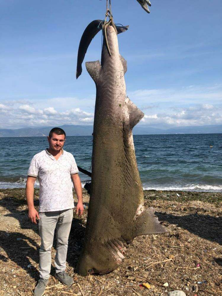 İlk kez Altıntaş açıklarında bu kadar büyük köpek balığının yakalandığını gören vatandaşlar şaşkınlığa uğrarken bol bol fotoğraf çektirdi. Dev balık çıkarıldığı sahilden iş makinesi yardımıyla kaldırıldı.