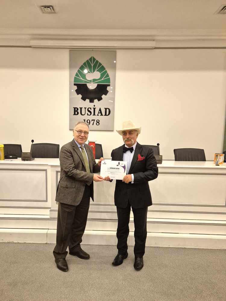 Soruları da yanıtlayan Prof. Dr. Ahmet Ayhan Çitil ve Bursa Felsefe Derneği Başkanı Gürkan Kaya'ya söyleşi sonunda, Çağdaş Eğitim Kooperatifi'nin “Kır Çiçekleri Okusun Diye” sosyal sorumluluk projesi, adlarına yapılan bağışın sertifikası, BUSİAD Yüksek Danışma Kurulu Başkanı Ergun Hadi Türkay tarafından sunuldu.