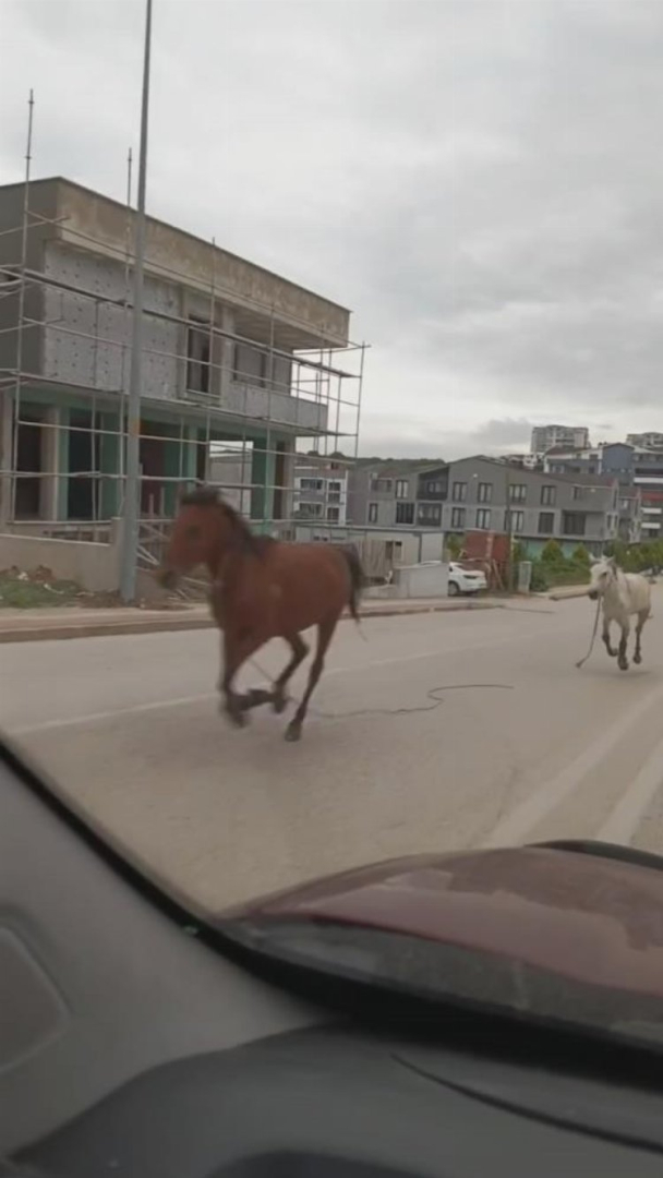 Cadde üzerinde araçlara aldırış etmeden koşan atlar sürücülerin şaşkın bakışları arasında ilerlerken, bazı vatandaşlar ise o anları kamerayla kayda aldı.