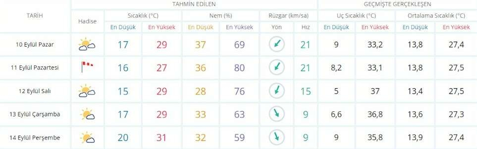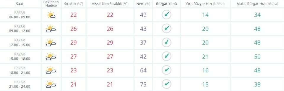 Hava Durumu: Parçalı ve az bulutlu, Rüzgar: Kuzey Ege'de kuzey ve kuzeydoğudan 5 ila 7, akşam saatlerine kadar yer yer 8; Güney Ege'de kuzey ve kuzeybatıdan 3 ila 5, kuzeyi yer yer 6 kuvvetinde, Dalga: 1,0 ila 2,0m, yer yer kuzeyi 2,5 ila 3,5 m, Görüş: İyi.