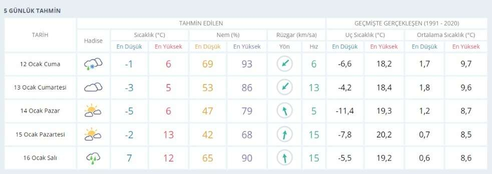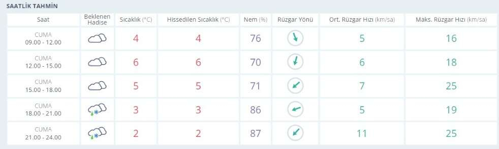 Meteoroloji Genel Müdürlüğü tarafından yapılan son değerlendirmelere göre, ülkemiz genelinin parçalı ve çok bulutlu, Marmara, Doğu Akdeniz ve İç Anadolu Bölgelerinin doğu kesimlerinin; Batı ve Doğu Karadeniz geneli ile Orta Karadeniz kıyılarının; Doğu ve Güneydoğu Anadolu Bölgelerinin yağışlı geçeceği tahmin ediliyor. Doğu Anadolu'nun güneydoğusu, Doğu Karadeniz'in doğusu ve İskenderun Körfezi çevrelerinde yer yer kuvvetli olması beklenen yağışların, Batı Karadeniz ile Orta ve Doğu Karadeniz'in iç kesimleri, İç Anadolu'nun doğusu ve Doğu Anadolu'da karla karışık yağmur ve kar, diğer yerlerde yağmur ve sağanak şeklinde görüleceği, kuzey, iç ve doğu kesimlerde ise buzlanma ve don olayı gerçekleşeceği tahmin ediliyor. Doğu Karadeniz'in iç kesimleri ile Doğu Anadolu'nun kuzey ve doğusunda çığ tehlikesi bulunmaktadır.