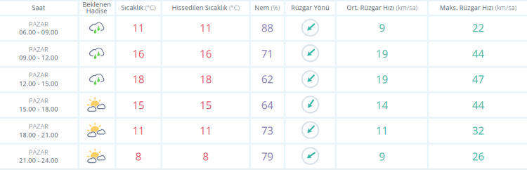 Meteoroloji Genel Müdürlüğü tarafından yapılan son tahminlere göre: Ülkemiz genelinin parçalı, yer yer çok bulutlu, Marmara’nın doğusu, Karadeniz, Doğu Anadolu’nun güneydoğusu, Güneydoğu Anadolu ile Hatay, Osmaniye, Adana, Mersin, Çankırı, Ardahan, Ağrı ve Muş çevreleri ile Kırklareli'nin kıyı, Çanakkale’nin iç, Balıkesir ve Erzurum'un kuzey kesimlerinin aralıklı yağışlı geçeceği tahmin ediliyor. Yağışların genellikle yağmur ve sağanak, Batı ve Doğu Karadeniz‘in iç kesimlerinin yüksekleri ile Ardahan, Şırnak, Hakkari ve Van’ın yüksek kesimlerinde karla karışık yağmur ve kar, Doğu Akdeniz'de yer yer gök gürültülü sağanak şeklinde olması bekleniyor. Yağışların Orta ve Doğu Karadeniz kıyıları, Sinop, Hakkari, Van, Bitlis, Şırnak, Siirt, Ş. Urfa, Batman ve Mardin çevreleri ile Kastamonu'nun kıyı kesimlerinde yer yer kuvvetli olacağı tahmin ediliyor. Bu sabah ve gece saatlerinde iç kesimlerde yer yer pus ve sis olayı bekleniyor.