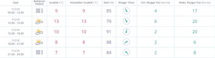 Ülkemiz genelinin parçalı ve çok bulutlu, Orta ve Doğu Karadeniz kıyılarının yağmur ve sağanak, Antalya'nın batı kesimlerinin sağanak ve gök gürültülü sağanak, Doğu Karadeniz’in iç kesimleri ile Erzincan, Erzurum, Tunceli, Elazığ, Bingöl, Muş, Kars, Ardahan ve Ağrı çevreleri ile Malatya'nın ve Sivas'ın kuzeydoğusunun karla karışık yağmur ve kar yağışlı geçeceği tahmin ediliyor. Yurdun iç ve doğu kesimlerinde buzlanma ve don ile birlikte pus ve yer yer sis hadisesi görüleceği tahmin ediliyor. Doğu Karadeniz’in iç kesimlerinin yüksekleri ile Doğu Anadolu’nun yüksek ve dik yamaçlarında çığ tehlikesi bulunmaktadır.