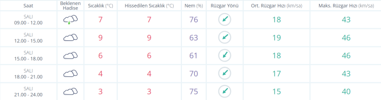 Genellikle çok bulutlu, kuvvetli kuzeyli rüzgar ve ani sıcaklık düşüşü ile birlikte özellikle gece saatlerinden itibaren karla karışık yağmur, kuzey kesimleri ve kentin yüksekleri hafif kar yağışlı