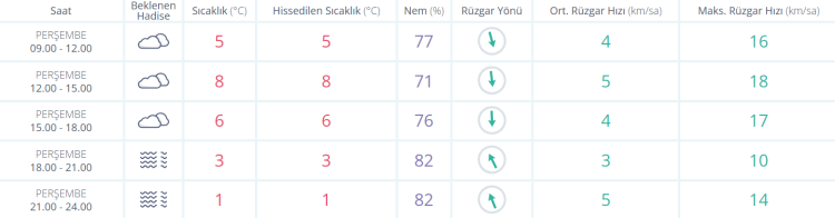 Meteoroloji Genel Müdürlüğü tarafından yapılan tahminlere göre: Ülkemiz genelinin parçalı ve çok bulutlu, Orta ve Doğu Akdeniz, İç Anadolu'nun doğusu, Karadeniz (Bolu hariç), Doğu ve Güneydoğu Anadolu ile Kocaeli, Sakarya, Bilecik ve Kütahya çevrelerinin aralıklı yağışlı geçeceği tahmin ediliyor. Orta ve Doğu Akdeniz kıyıları, Orta ve Doğu Karadeniz kıyıları ve Güneydoğu Anadolu'nun güneyi ile Osmaniye çevrelerinin yağmur, yağış alan diğer yerlerde karla karışık yağmur ve kar şeklinde olması beklenen yağışların, İç Anadolu'nun doğusu ve Doğu Anadolu’nun güney ve batısı ile Kahramanmaraş, Ordu, Giresun ve Siirt çevreleri, Adana ve Hatay kıyıları, Diyarbakır'ın, Adıyaman'ın ve Batman'ın kuzey kesimlerinde yer yer kuvvetli olacağı tahmin ediliyor. Yurdun iç ve doğu kesimlerinde buzlanma ve don ile birlikte pus ve yer yer sis bekleniyor. Doğu Karadeniz’in iç kesimlerinin yüksekleri ile Doğu Anadolu’nun yüksek ve dik yamaçlarında çığ tehlikesi bulunmaktadır.