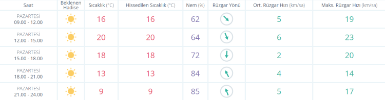 Meteoroloji Genel Müdürlüğü tarafından yapılan tahminlere göre: Ülkemiz genelinin parçalı ve az bulutlu, güneydoğu kesimler yer yer çok bulutlu, Diyarbakır, Mardin, Batman, Siirt ve Şırnak çevreleri ile Malatya ve Elazığ'ın güney ilçelerinin sağanak ve gök gürültülü sağanak yağışlı geçeceği tahmin ediliyor. Sabah ve gece saatlerinde doğu bölgelerde buzlanma ve don olayı, Marmara, Ege ve Karadeniz ile doğu kesimlerde pus ve yer yer sis bekleniyor. Doğu Karadeniz’in iç kesimlerinin yüksekleri ile Doğu Anadolu’nun yüksek ve eğimli yamaçlarında çığ tehlikesi bulunmaktadır.