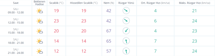 Meteoroloji Genel Müdürlüğü tarafından yapılan tahminlere göre: Yurdun batı kesimlerinin parçalı bulutlu, gece saatlerinden sonra Edirne ve Tekirdağ çevreleri ile Çanakkale'nin kuzey ilçelerinin sağanak yağışlı, diğer yerlerin az bulutlu ve açık geçeceği tahmin ediliyor. Gece ve sabah saatlerinde doğu kesimlerde buzlanma ve don olayı, yurt genelinde pus ve yer yer sis bekleniyor. Doğu Karadeniz’in iç kesimlerinin yüksekleri ile Doğu Anadolu’nun yüksek ve eğimli yamaçlarında çığ tehlikesi bulunmaktadır.