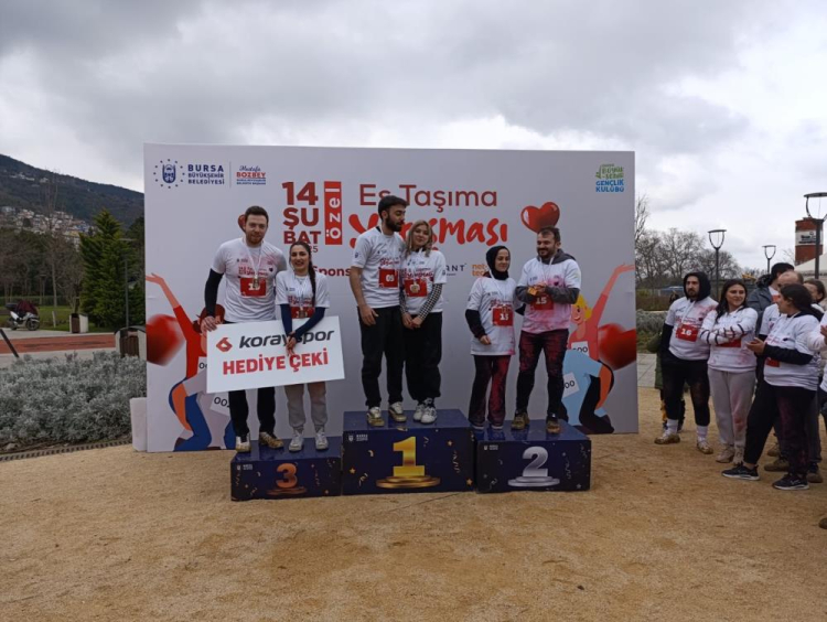 Bursa Büyükşehir Belediyesi'nin hazırladığı, Bursa Millet Bahçesi'nde gerçekleşen eş taşıma yarışması düzenlendi. Birçok çiftin katıldığı yarışmada renkli anlar kameralara yansıdı. Zorlu parkurların olduğu yarışmada eşler kıyasıya rekabet ederken yere düşen çiftler ise pes etmeden yerden kalkarak 1'inci olmak için yarıştı. Eşlerini sırtına alan çiftler kıyasıya rekabet etti. Yaş kategorilerinin olduğu yarışmaya gencinden yaşlısına herkes katılarak, yağmur çamur dinlemeden keyifle yarıştı. Yarışmada kazanan çiftlere Burfaş'ta yemek çeki ve birçok ödül takdim edildi. Yarışmayı kazanan ve yarışmaya katılanlar birlikte toplu hatıra fotoğrafı çekildi.