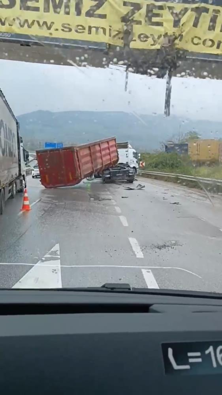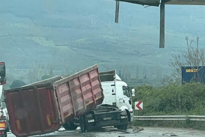 Bursa'nın Gemlik ilçesinde seyir halindeki tırın damperi açılarak üst geçide çarptı. Kaza sonrası trafik tek şeritten ilerlerken, tır çekici yardımıyla yoldan kaldırıldı.
