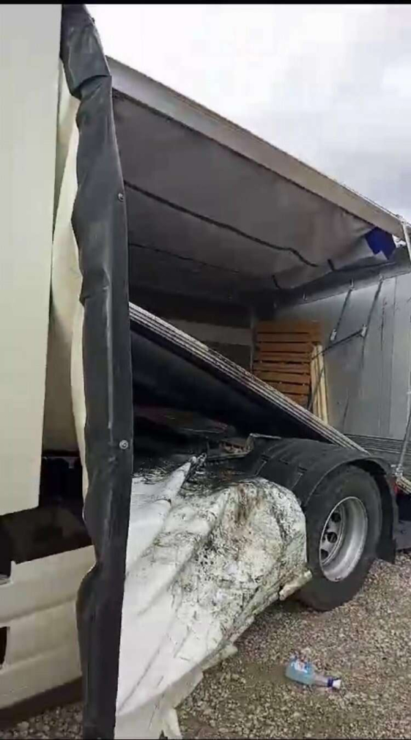 Bursa’da etkili olan fırtına Erik Su Fabrikası'nın bahçesindeki TIR'ları devirdi.