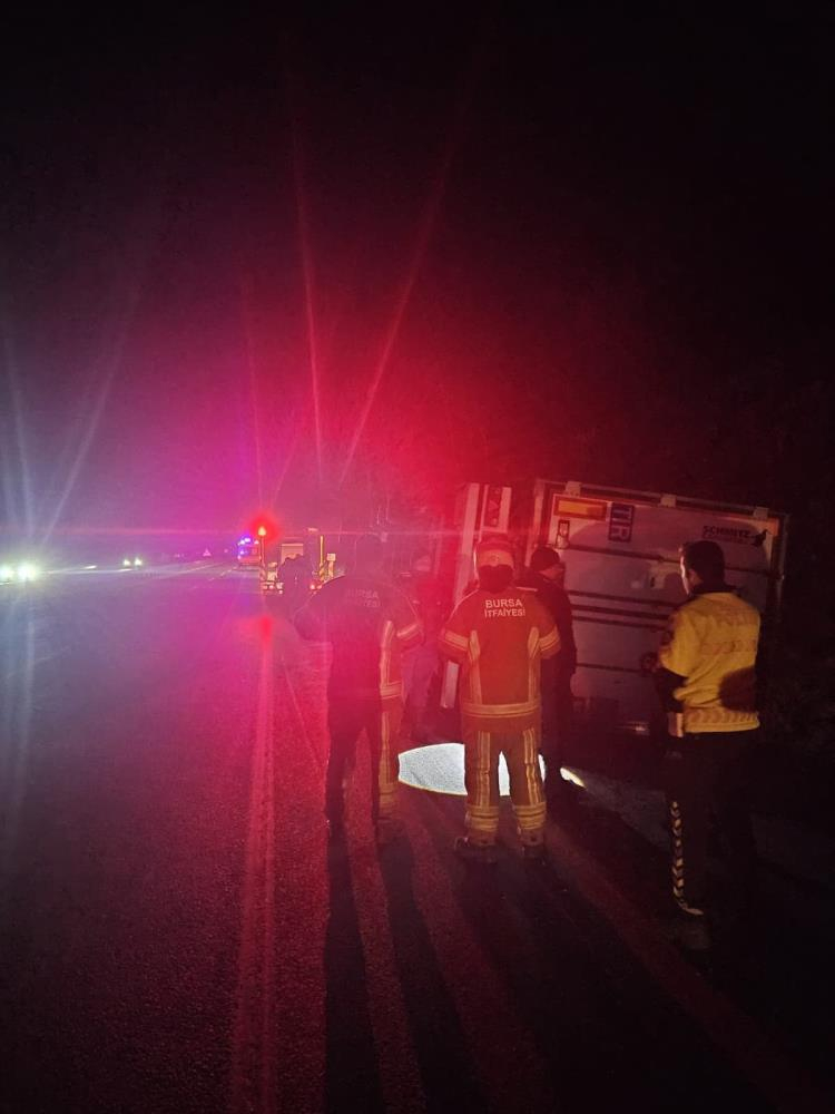 Kaza saat 05.30 sıralarında Bursa-Ankara karayolu üzeri İnegöl'ün Mezit-5 mevkiinde meydana geldi. Bozüyük istikametinden İnegöl'e seyir halinde olan Sürücü Saffet S.(33) yönetimindeki 35 CYB 918 plakalı patates yüklü TIR, sürücüsünün kontrolünden çıkarak yolun kenarına devrildi. Kaza yerine 112 jandarma ve itfaiye arama kurtarma ekipleri sevk edildi. Ekipler kabinde mahsur kalan sürücüyü kurtardılar. Kazayı burnu bile kanamadan atlatan şoför, hastaneyi gitmeyi reddedince Ambulansta tedavi edildi.