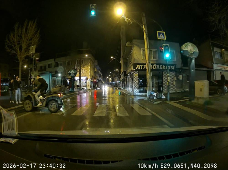 Bursa’nın Osmangazi ilçesinde ATV üzerinde drift atan iki arkadaşın trafiği tehlikeye düşürdüğü anlar kameraya yansıdı. Kontrolden çıkan ATV’nin kaldırıma çarpması sonucu iki arkadaş kazayı kıl payı atlattı.