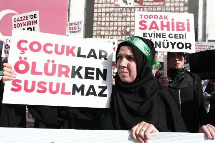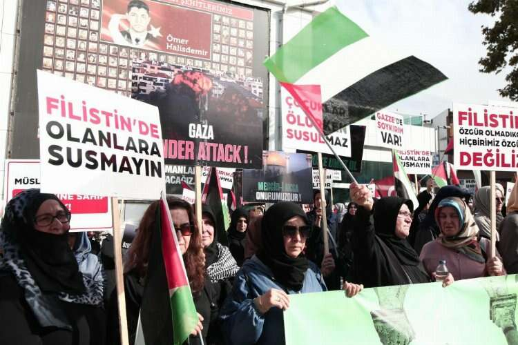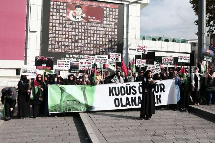 Gazze’de tüm dünyanın gözü önünde savaş suçu işlendiğini söyleyen kadınlar, “Bizler vicdan sahibi Sivil Toplum Örgütlerinin Kadın Temsilcileri ve anneler olarak İsrail'in Gazze Şeridi'nde 17 gündür sürdürdüğü katliama ‘dur’ demek için buradayız. Bizimle aynı duyguları paylaşan herkesi İşgalci İsrail’in Gazze Şeridi'ne yönelik saldırılarını bir an önce durdurması için harekete geçmeye davet ediyoruz. Apartheid rejimi, yaklaşık yüz yıldır Filistinlilerin topraklarını işgal ederek defalarca katliam gerçekleştirdi. İki milyondan fazla insanın yaşadığı Gazze Şeridi'ne ise 17 yıldır abluka uygulayarak bölgeyi adeta bir toplama kampına çevirdi. Gazze Şeridi'ne yönelik yıllardır süren bombalı saldırılarda sahilde piknik yapan aileleri, sokakta oyun oynayan çocukları, hastanelerde tedavi bekleyen hastaları, ibadethaneleri, insanın en güvenli sığmağı olan evlerinde aileleri, en çok da kadın ve çocukları hedef aldı ve maalesef Gazze'de hiçbir yer güvenli değil. Gazze'de devam eden saldırılarda okullar, camiler, hastaneler vurularak dünyanın gözü önünde savaş suçu işleniyor. İşgalci İsrail Yönetimi askerlerine yargılanmayacaklarının güvencesini vererek bunun yolunu açtı ve tam 17 gündür bütün uluslararası hukuk kurallarını ve insanlığı ayaklar altına aldı. Bu sürecin son halkası olarak Gazze Şeridi'nde gerçekleştirdiği katliamlarda yine yüzlerce kadın ve çocuk işgalcilerin açık hedefi oldu. 17 Ekim Salı gecesi İsrail'in El-Ehli Baptist Hastanesi'ni bombalaması sonucu büyük çoğunluğu çocuk ve kadınlardan oluşan 500'den fazla insan katledildi. İşgalci İsrail, daha güvenli olduğunu düşündükleri için sığındıkları hastanenin bahçesinde oyun oynayan, yemek yiyen çalışan masum çocuk ve kadınları vahşice katletti. Anneler ve babalar çocuklarının paramparça olan cesetlerini toplayıp poşetlere koyarak defnetmek zorunda kaldı” dedi.