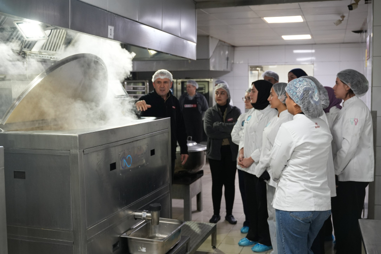 Öğrenciler ayrıca işletmede kullanılan modern mutfak ekipmanlarını yakından inceleyerek, sektörde yaygın olarak kullanılan üretim teknolojileri hakkında uygulamalı gözlem gerçekleştirdi. Teknik gezi, öğrencilerin toplu yemek üretim sektörünü yerinde tanımalarına olanak sağlayarak mesleki farkındalıklarını artırdı; teorik bilgilerini pratik uygulamalarla pekiştirmelerine katkı sundu.