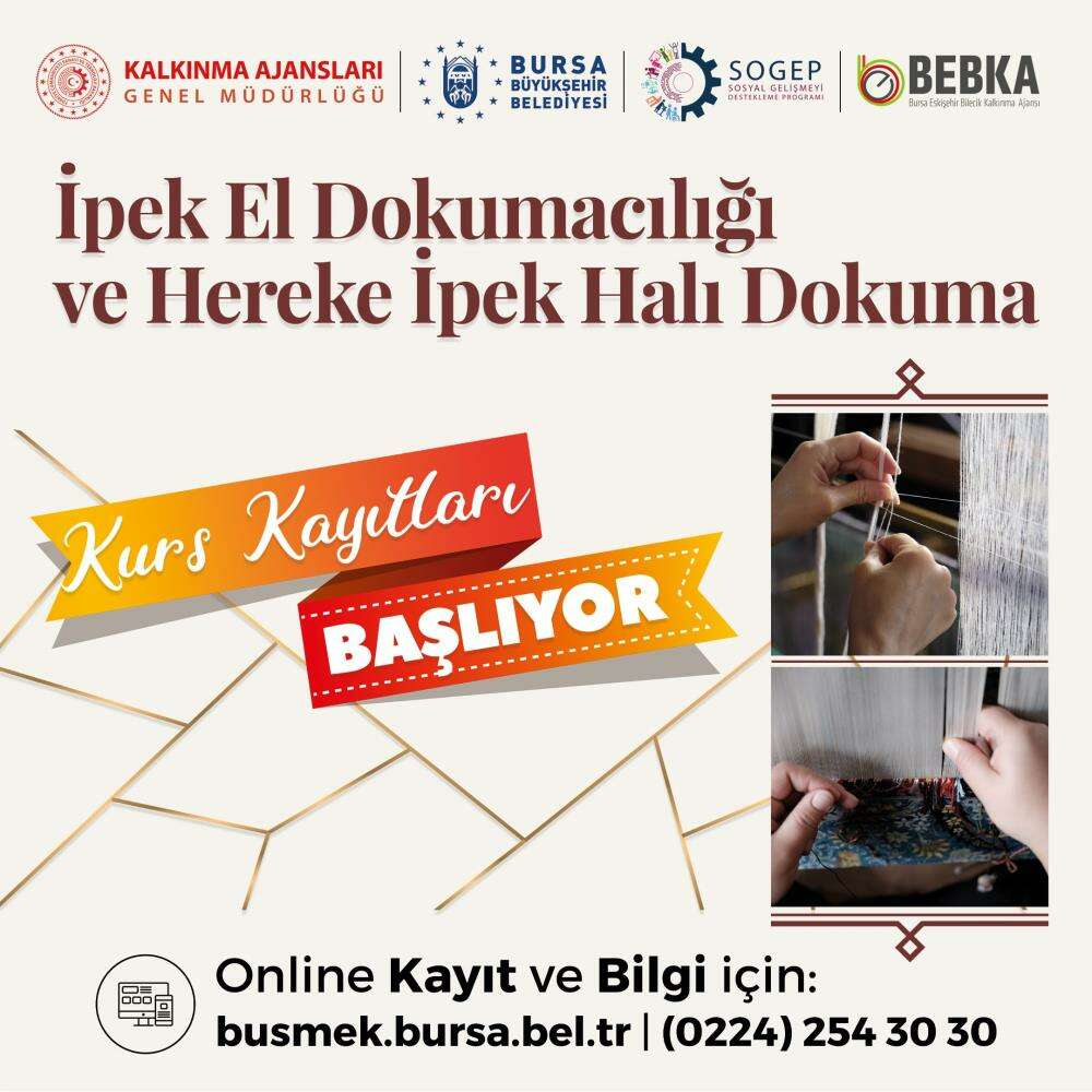 “İpek El Dokumacılığı” ve “Hereke İpek Halı Dokuma” kurslarına katılmak isteyen kişiler, busmek.bursa.bel.tr internet adresindeki online başvuru kısmından ön kayıt yaptırabilecekler.