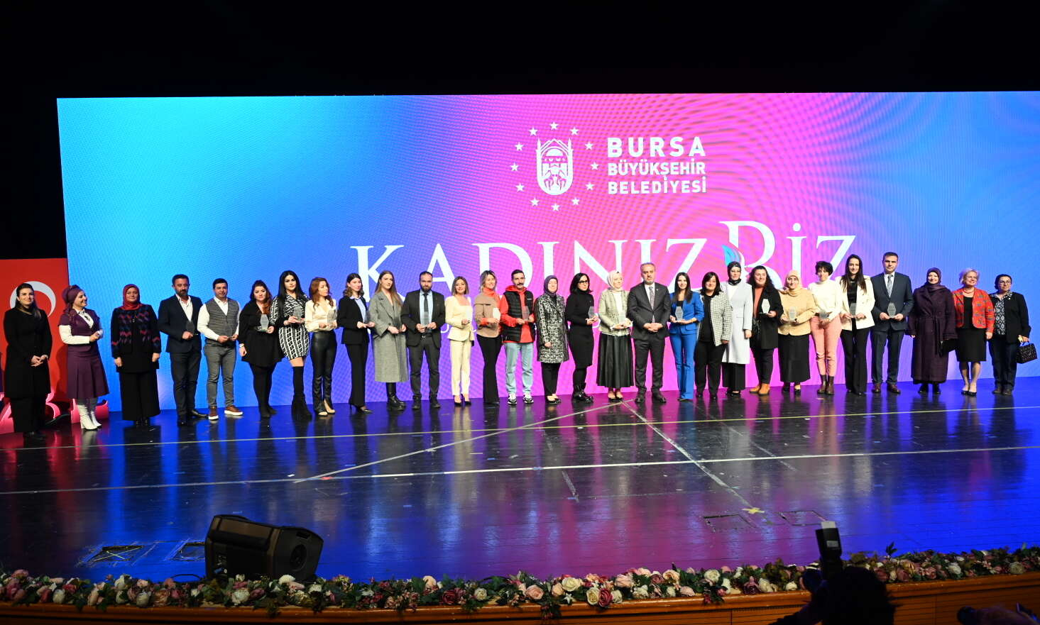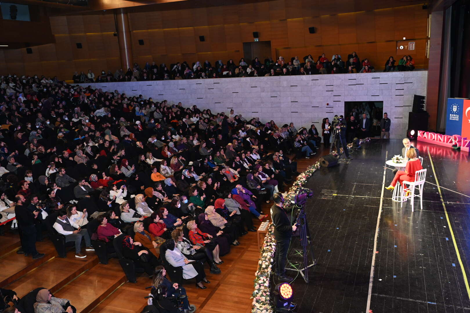 Bursa Büyükşehir Belediye Başkanı Alinur Aktaş da sahnedeki dev telefon ekranından hem uygulamayı tanıttı hem de Ceyda Düvenci’nin sorularını yanıtladı. Uygulamanın belediyenin öz kaynaklarıyla Bilgi İşlem Dairesi Başkanlığı tarafından geliştirildiğinin altını çizen Başkan Aktaş, “Her yıl yaptığımız saha çalışmaları sonucunda şehrimizde kadın hizmetleri ile ilgili kadınların beklentilerinin daha fazla olduğunu gördük. Kadınların toplumsal sorunlarına çözüm üretmek ve kadın çalışmalarımızı daha etkin kılmak adına Aile, Kadın ve Çocuk Hizmetleri Şube Müdürlüğümüzü kurduk. Büyükşehir Belediyesi olarak bu uygulamayla kadın çalışmalarını daha geniş kitlelere ulaştırmak, kadın dayanışmasını desteklemek ve sosyal hayata katılımlarını artırmak ana hedeflerimiz oldu. Eşitsizliklerin azaltılması, sorumlu üretim ve tüketim, sağlıklı ve kaliteli yaşam, kadın-erkek fırsat eşitliği ve kaliteli eğitim temel dayanaklarımız oldu. Uygulamamız, yerelde kadınlara rehber niteliğini taşıyor. Hem STK’lar hem yerel yönetimler hem de kamu kurumlarının çalışmalarını kapsayan çatı uygulama yaptık. Uygulamamızı Bursa Büyükşehir Kadın Kulübü adıyla marketlerden indirebilirsiniz” diye konuştu.