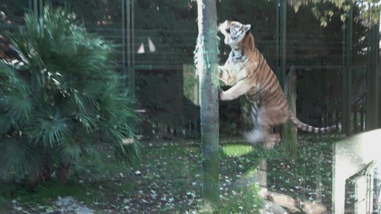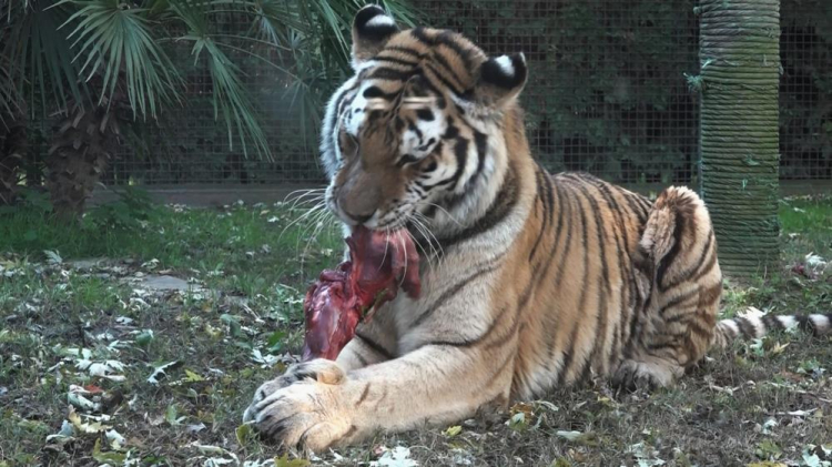 Direğin üzerine bakıcısı tarafından asılan etin kokusunu alan amur kaplanı, yuvasından çıktıktan sonra gözüne kestirdiği eti tek hamlede kaptı. Afiyetle etini yiyen kaplan, bu egzersizlerle ormanda yaşamış gibi zinde ve çevik kalıyor.