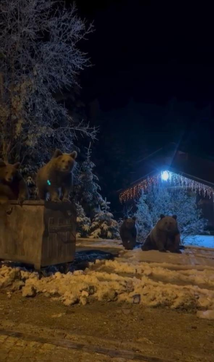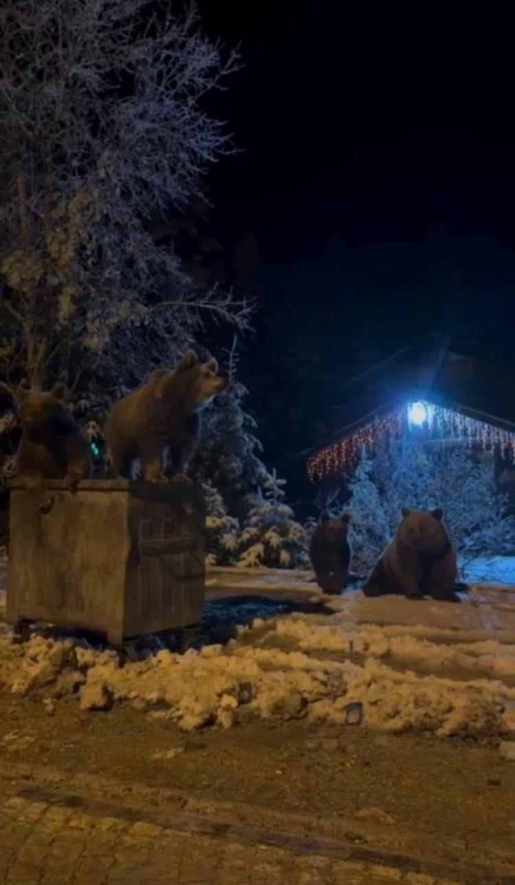 Bursa Uludağ'da yerleşim alanlarına inen ayılar, çöp konteynerlerinin üzerinde dolaştı. Çöp konteynerini karıştıran 1 anne ve 3 yavru ayının, bölgede kar yağmasına rağmen hala kış uykusuna yatmamaları dikkat çekti.