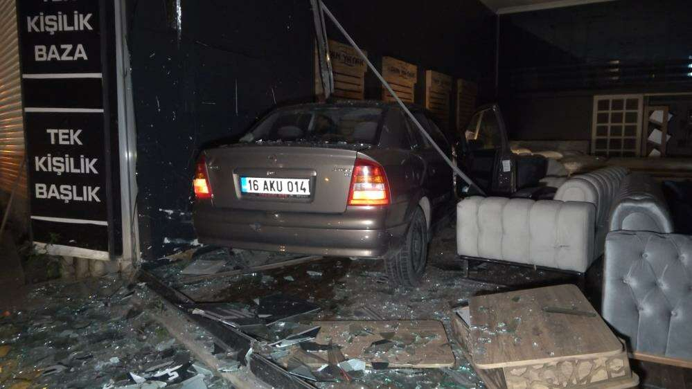 Kaza, saat 02.00 sıralarında Osmangazi ilçesi Gaziakdemir Mahallesi’nde meydana geldi. Mudanya Bulvarı üzerinde seyir halinde olan Nevzat M. idaresindeki 16 AKU 014 plakalı otomobil lastiğinin patlaması sonucu sürücüsünün kontrolünden çıkarak mobilya dükkanına girdi. Kazada mobilyacı dükkanının camları kırılırken eşyalar etrafa saçıldı. Çevredeki vatandaşların haber vermesi üzerine olay yerine polis ekipleri sevk edildi. Otomobilde bulunan sürücü kazayı yara almadan atlattı.