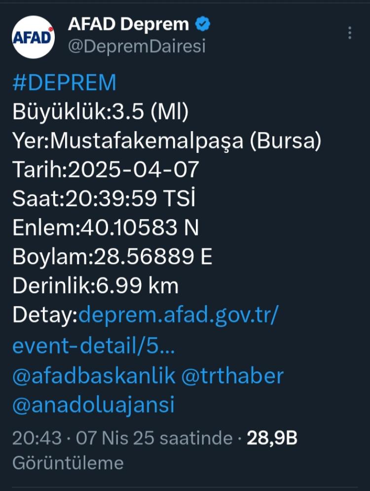 Bursa Mustafakemalpaşa'da saat 20:39'da derinliği 6.99 kilometrede 3.5 büyüklüğünde bir deprem meydana geldi.