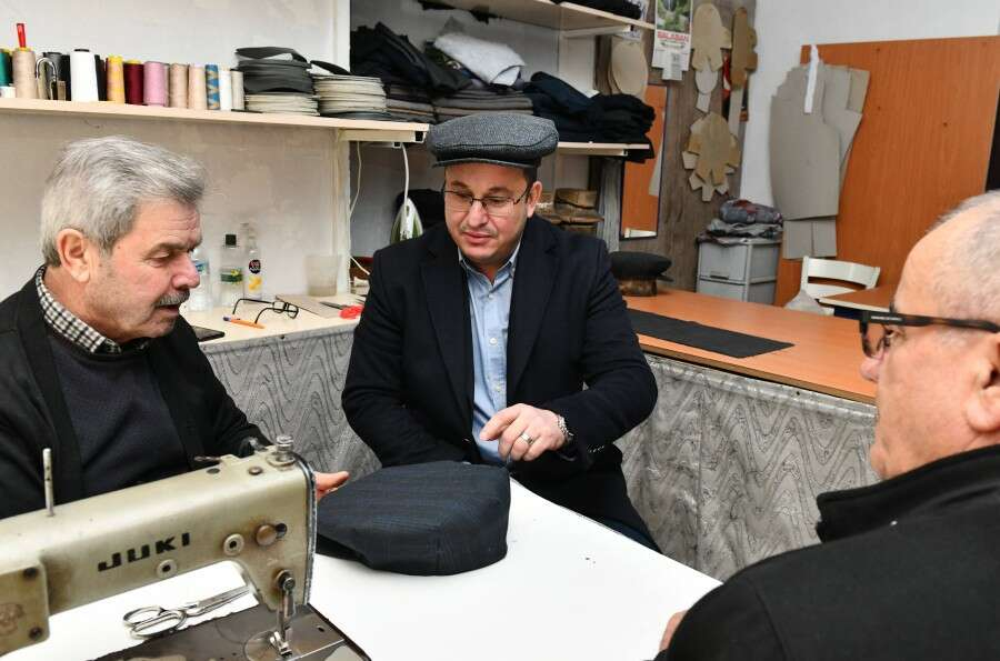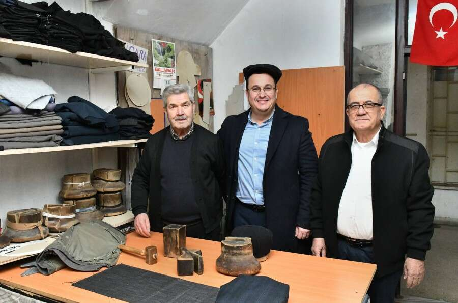 Mustafakemalpaşa Belediye Başkanı Mehmet Kanar, ilçede 53 yıldır meşhur Bursa şapkası üreten mesleğin son temsilcisi Hüseyin Doğualp'i işyerinde ziyaret etti.