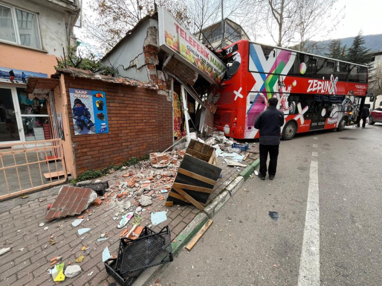 Bursa'da bir liseden öğrenci almak için yanaşan tur otobüsü, imdat frenlerinin boşalması üzerine önce bir araca daha sonra da manava çarparak durabildi. Kazada büyük şans eseri yaralanan olmazken, ortalık savaş alanına döndü. Manavda çalışan bir kişi büyük şok yaşadı. Öğrencilerin araçta olmaması da muhtemel bir faciayı önledi.