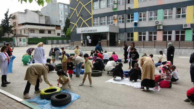 Bursa’da Gazi İlkokulu’nda yapılan etkinlikle yaklaşık 100 veli ve öğrenci eski lastikleri boyayarak saksı yaptı. Renkli lastiklerle birlikte okula yeşil alan kazandırılırken veliler de çocukları ile birlikte keyifli vakit geçirdi. Saksı lastiklere çiçeklerin yanı sıra maydanoz, domates ve çeşitli bitkiler dikildi.