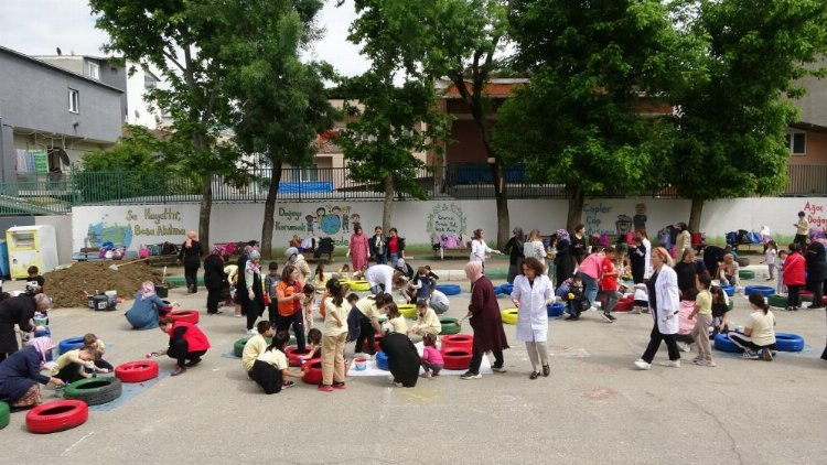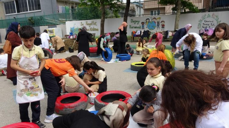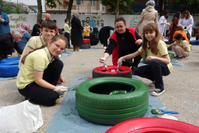 Öğrenciler, veliler ve öğretmenlerin katıldığı etkinlikte eski lastikler boyanarak geri kazandırıldı.