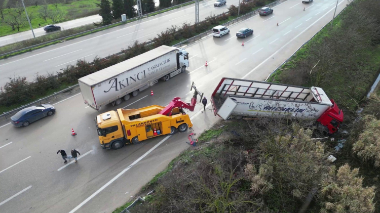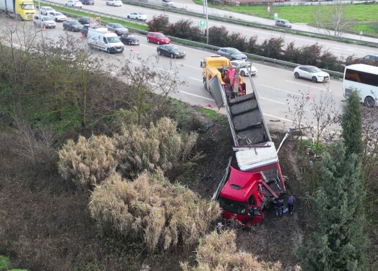 Bursa'nın Osmangazi ilçesi Çağlayan Köyü mevkiinde otobanda seyir halindeki tır kontrolden çıkıp refüje daldı. Bariyerleri aşan araç, girdiği refüjde mahsur kaldı. Çevredekiler kazaya karışan tırın sürücüsü için yardıma koşarken, 112 ekiplerine bilgi verildi. Olay yerine gelen sağlık ekiplerince ilk müdahalesi ambulansta yapılan sürücünün tedavisi sürerken, kaza sebebiyle trafikte uzun kuyruklar oluştu. O anlar havadan dron ile görüntülenirken, refüje saplanan tır kurtarıcıyla bulunduğu yerden alındı.