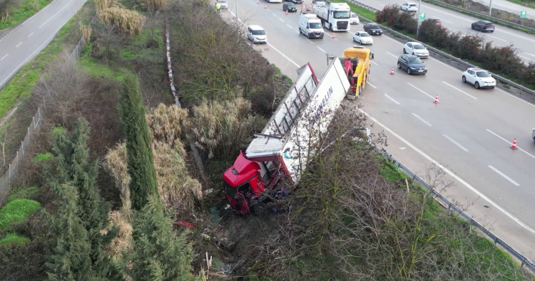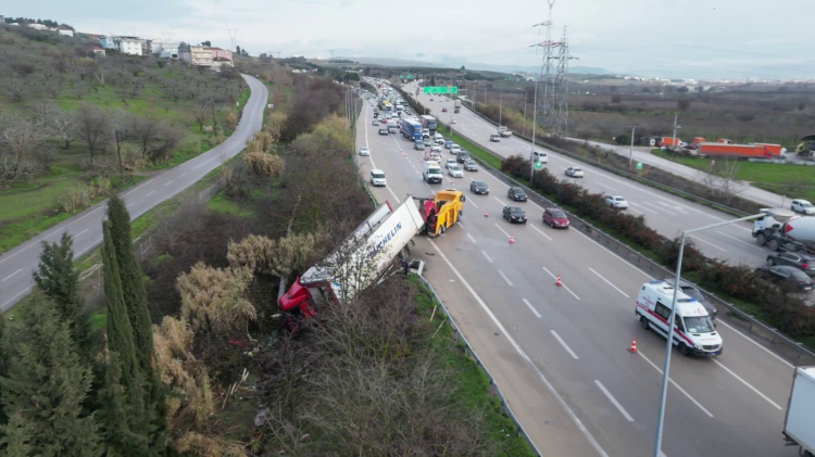Bursa'da kontrolden çıkan tır refüje uçtu. Facianın teğet geçtiği kazada sürücü yaralanırken, otobanda trafik uzun kuyruklar oluşturdu.