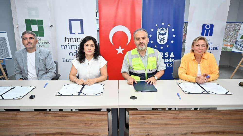 Konuşmaların ardından iş birliği protokolü Başkan Alinur Aktaş ile Mimar Odası Bursa Şube Başkanı Şirin Rodoplu, Şehir Plancıları Odası Bursa Şube Başkanı Murat İlkme ve İnşaat Mühendisleri Odası Bursa Şube Başkanı Ülkü Küçükkayalar arasında imzalandı.