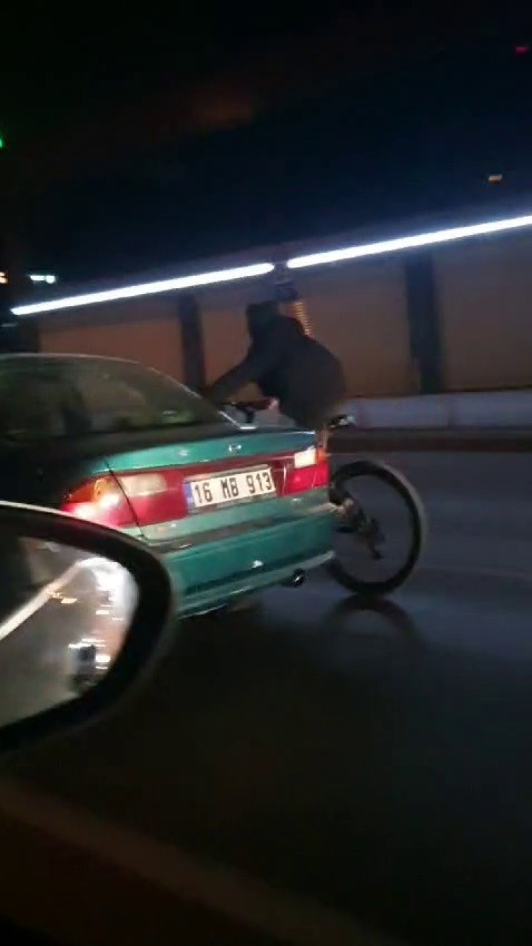 Merkez Yıldırım ilçesi Ankara Yolu Caddesi Mimar Sinan metro istasyonu yakınlarında, bisiklet sürücüsü seyir halinde olan 16 MB plakalı otomobile tutunarak ilerledi. O anlar saniye saniye amatör kamera ile kaydedildi.