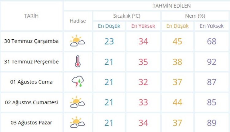 30 Temmuz Çarşamba günü parçalı bulutlu bir hava beklenirken, sıcaklık 23-34°C arasında olacak. En yüksek nem oranı ise %68 seviyesinde ölçülecek. 31 Temmuz Perşembe günü termometreler 35°C’ye kadar çıkarken, nem oranı %92’ye ulaşarak boğucu bir hava yaşanacak. Vatandaşların özellikle yaşlılar, çocuklar ve kronik hastalığı bulunan bireylerin dikkatli olmaları konusunda uyarı yapıldı. 1 Ağustos Cuma günü ise sağanak yağış ve gök gürültüsüyle serinleme bekleniyor. Ancak sıcaklıklar 21-32°C aralığında seyredecek ve nem %87’ye kadar çıkacak. 2 Ağustos Cumartesi günü parçalı bulutlu bir gökyüzü beklenirken, sıcaklık 21-33°C olacak. Nem oranı yine yüksek seyredecek: %85. 3 Ağustos Pazar günü de benzer hava koşulları devam edecek. Hava açık ve az bulutlu, sıcaklık 21-34°C, nem oranı ise %89 olarak tahmin ediliyor.