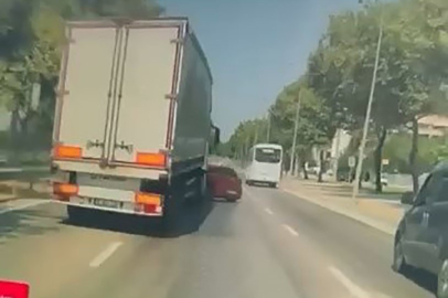 Kaza, Bursa'nın en işlek Ata Bulvarında meydana geldi. Bir aracın kamerasına yansıyan görüntülerde, şeritlerinden hareket eden araçlar, lambaları geçince yön değiştirmek istedi. Sol şeritten ilerleyen tır, beyaz otomobilin ilerlediğini görünce orta şeride geçmek istedi. Ancak orta şeritte kör noktasında kalan kırmızı aracı fark etmedi. Direksiyonu sağa kırmasıyla birlikte, kırmızı araç tırın önünü yan dönerek sürüklenmeye başladı. Kısa süre sonra otomobili fark eden tır sürücüsü, durdu.
