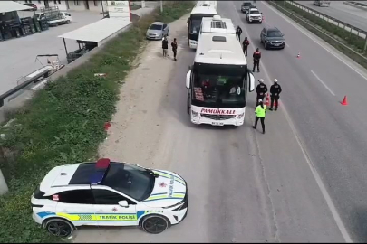 Bursa İstanbul yolu üzerinde bulunan Gemlik ilçesinde Emniyet Müdürlüğü'ne bağlı trafik ekipleri yol denetimlerini aralıksız sürdürüyor. 'Yolun sonu bayram olsun' sloganıyla sıklaştırılan denetimlerde, otobüslerdeki vatandaşlar da bilgilendirildi.