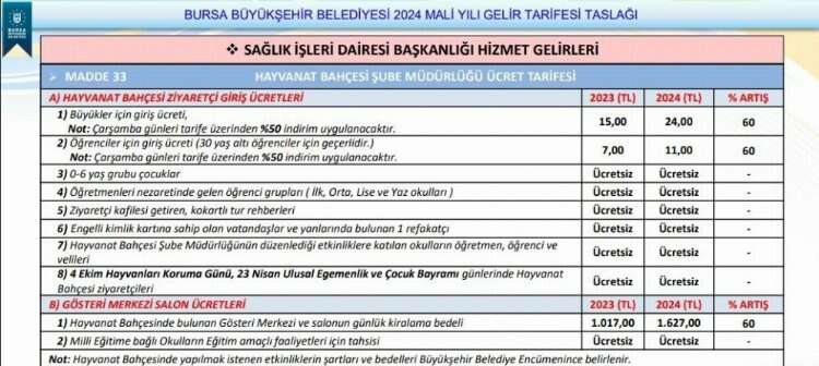 Ailelerin, çocuklarıyla gönüllerince gezip eğlendiği Bursa Hayvanat Bahçesi'nin fiyat tarifesi, 2024 yılında zamlanıyor. Dünya standartlarında modern bahçe olarak 206 bin 600 metrekarelik alan üzerine kurulan Bursa Hayvanat Bahçesi'ne girişlerde yetişkin 15 liradan 24 liraya çıkarken, öğrenci ise 7 liradan 11 liraya yükseldi. 129 türden 969 hayvana ev sahipliği yaptığı hayvanat bahçesinin fiyat tarifesi Bursa Büyükşehir Belediyesi 2024 Mali Yılı Gelir Tarifesi Taslağı'nda yer aldı.