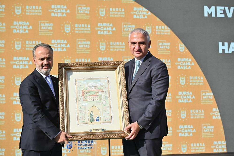 Konuşmaların ardından Bursa Büyükşehir Belediye Başkanı Alinur Aktaş, Bakan Ersoy’a günün anısına ipek tabloya nakşedilmiş Bursa Mevlevihanesi’nin orijinal minyatürünü hediye etti.