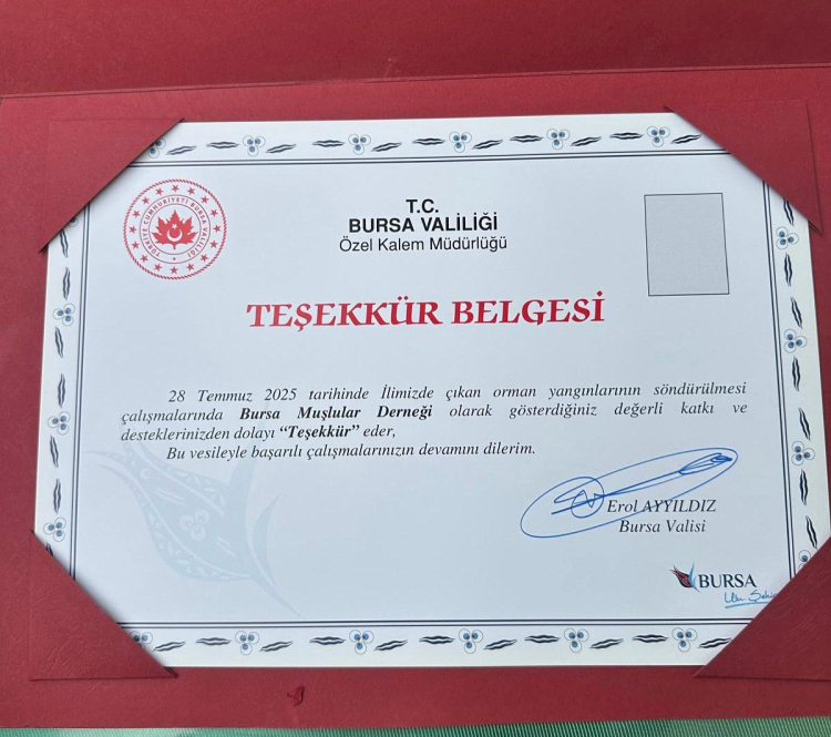 Bursa Valisi Erol Ayyıldız, geçtiğimiz günlerde il genelinde meydana gelen orman yangınlarına özveriyle müdahale eden Bursa Muş-Der Arama ve Kurtarma Ekibi ile faaliyette bulunan bazı sivil toplum kuruluşlarına takdir belgesi takdim etti.