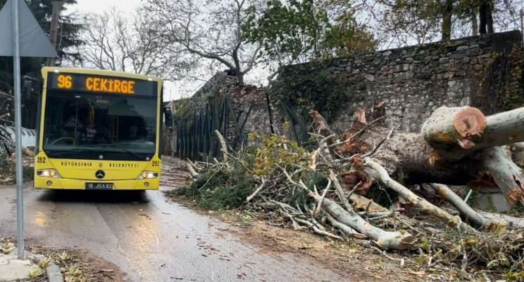 Bursa'da 510 yıllık geçmişi bulunan tarihi Hüsnügüzel Kaplıcası'nın bahçesindeki 250 yıllık anıt çınar ağacı fırtınaya dayanamadı. Saatteki hızı 95 kilometreye ulaşan fırtına sebebiyle devasa çınar kökünden koparak yola devrildi. Ekipler ağacın dallarını keserek trafiği açtı .