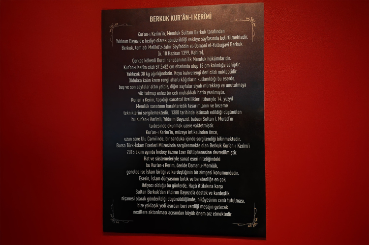 Memlük Sultanı Berkuk tarafından 14. yüzyılda Osmanlı padişahı Yıldırım Bayezid’a hediye edilen ve “Berkuk Kur’ân-ı Kerîmi” olarak bilinen tarihi eser, Bursa’nın fethinin 700. yılı kapsamında ziyaretçilerin beğenisine sunuldu. Eser, Türk İslam Eserleri Müzesi’nde ziyarete açıldı.