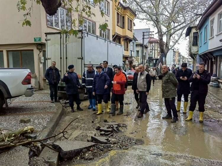 Dün gece yağan şiddetli yağmur sonrası yaşanan sel Rumlardan kalma tarihi evleri ve kiliseleri ile ünlü Mudanya'nın Tirilye Mahallesinde zarara yol açtı.