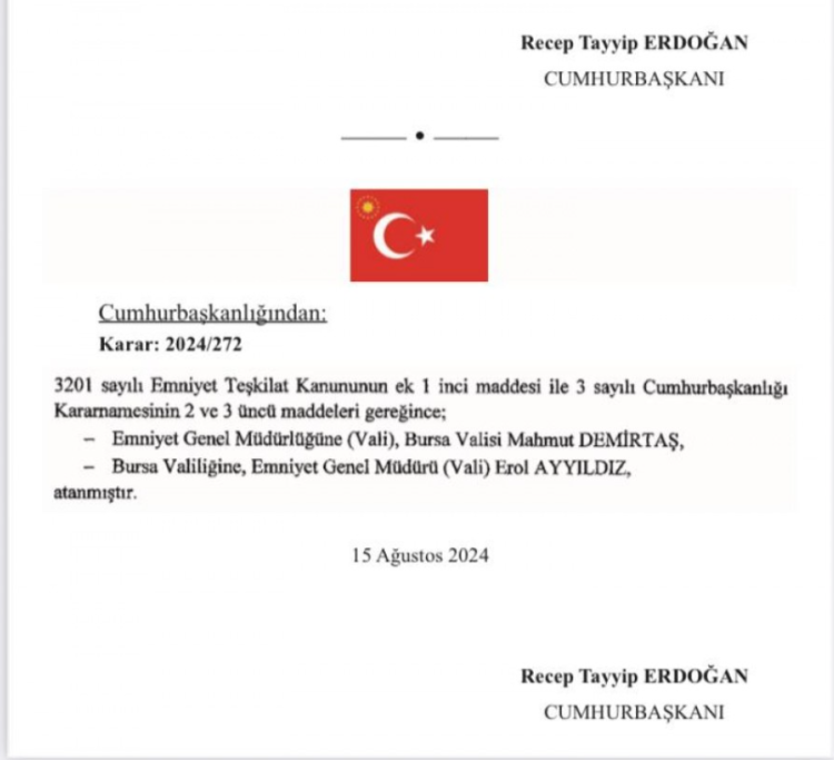 Emniyet Genel Müdürlüğü'ne atanan Mahmut Demirtaş'ın yerine Bursa Valisi olarak Emniyet Genel Müdürü Erol Ayyıldız atandı.