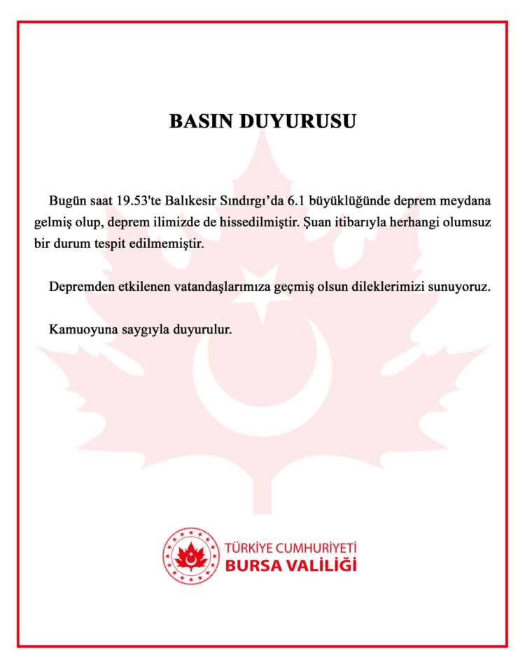 Balıkesir'de meydana gelen, Bursa ve Marmara Bölgesi genelinde yoğun şekilde hissedilen deprem ile ilgili Bursa Valiliği açıklamada bulundu.