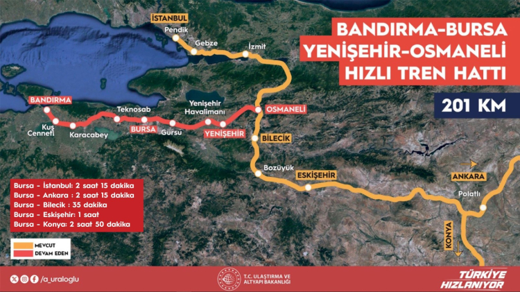 Bakan Uraloğlu’nun Osmaneli-Bursa arası yüksek hızlı tren hattının önümüzdeki yıl hizmete açılacağını, projenin tamamının ise 2028 yılı sonuna kadar bitirileceğini açıklamasına da değinen Gürkan, "Bakanımızın liderliğinde, bakanlık yetkililerimizin yoğun gayreti ile yürütülen Bursa-Ankara hızlı tren hattında seferler 2026 yılının ortasında başlayacak. Bu, kentimizin ulaşım altyapısında çok büyük bir dönüm noktası olacak" ifadelerini kullandı.