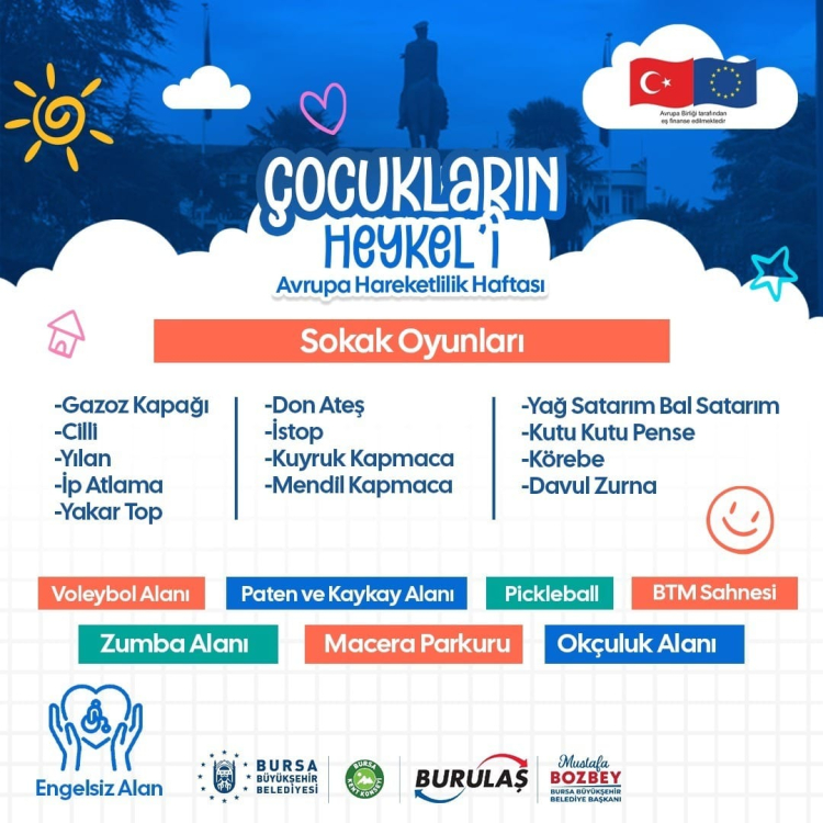 Bursa Büyükşehir Belediye Başkanı Mustafa Bozbey’in saat 09.30’da Tophane Saltanat Kapısı’ndan başlatacağı ‘Yeşil Pedalla Yeniden Yeşile’ bisiklet etkinliğiyle start alacak olan program, çocuklara ve yetişkinlere unutamayacakları bir gün geçirme fırsat sunacak. Ulucami ile Valilik Binası arasında yapılacak programda, bisiklet ve e-skuter sürüş eğitimlerinin yanı sıra 4 farklı alanda gazoz kapağı, cilli, ip atlama, yakar top, istop, körebe, kutu kutu pense gibi sokak oyunları oynanacak. Araba sesleri ile değil, çocuk gülüşleri ile dolacak olan Heykel’de Bursalılar eğlence dolu bir gün geçirecek.